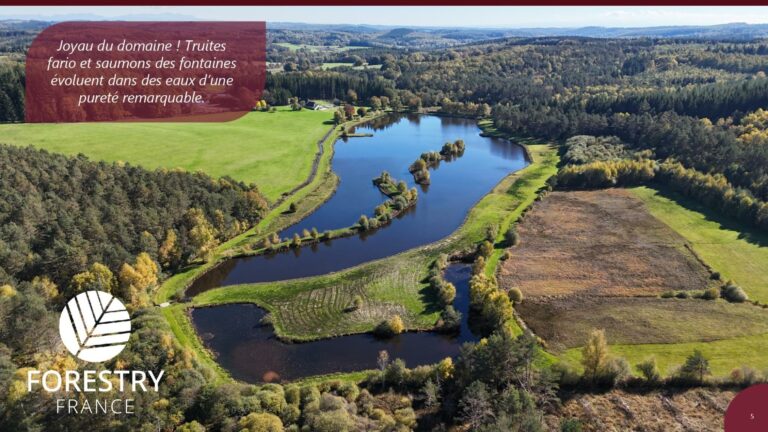 Au cœur du domaine s’étend un superbe miroir d’eau de plus de 7 hectares, l’un des trois étangs qui façonnent ce paysage unique. Les eaux cristallines abritent truites fario et saumons de fontaine, témoins de la qualité incomparable du milieu naturel.